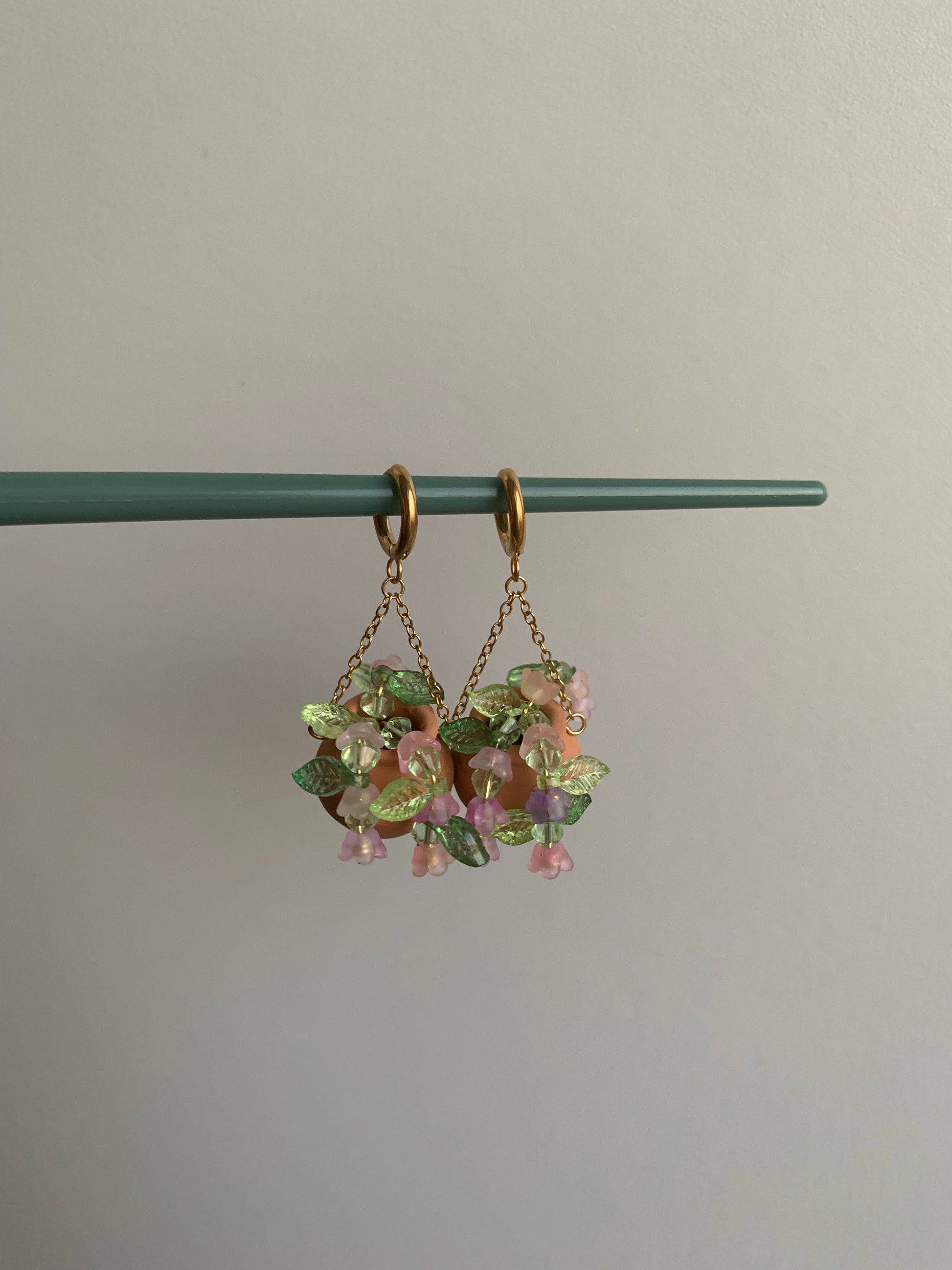 Real mini Terracotta pots adorned with beaded flower vines with Stainless Steel findings & hoops