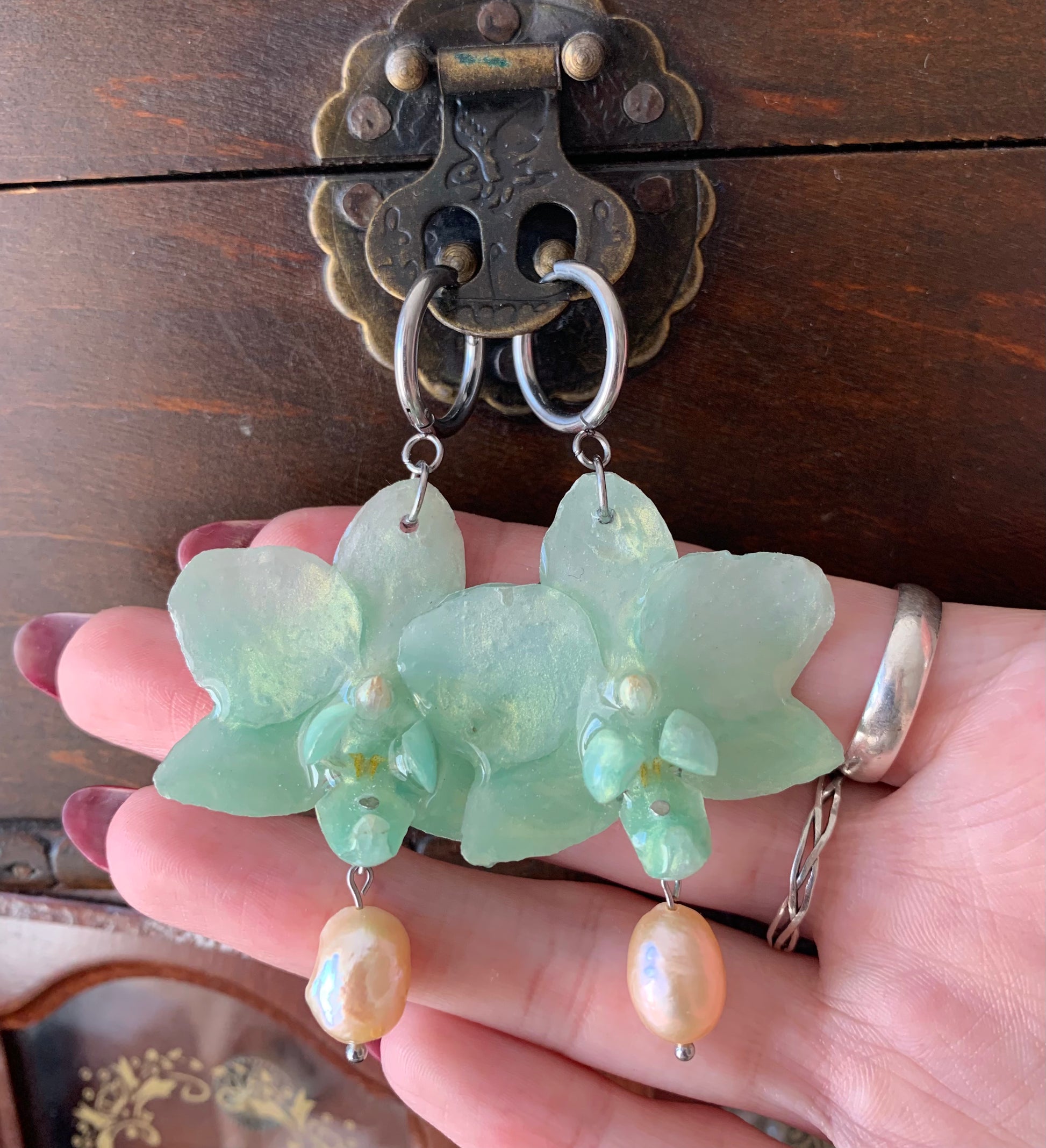 Real Orchid flowers preserved in resin with Freshwater Pearls on Stainless Steel Hoops.
