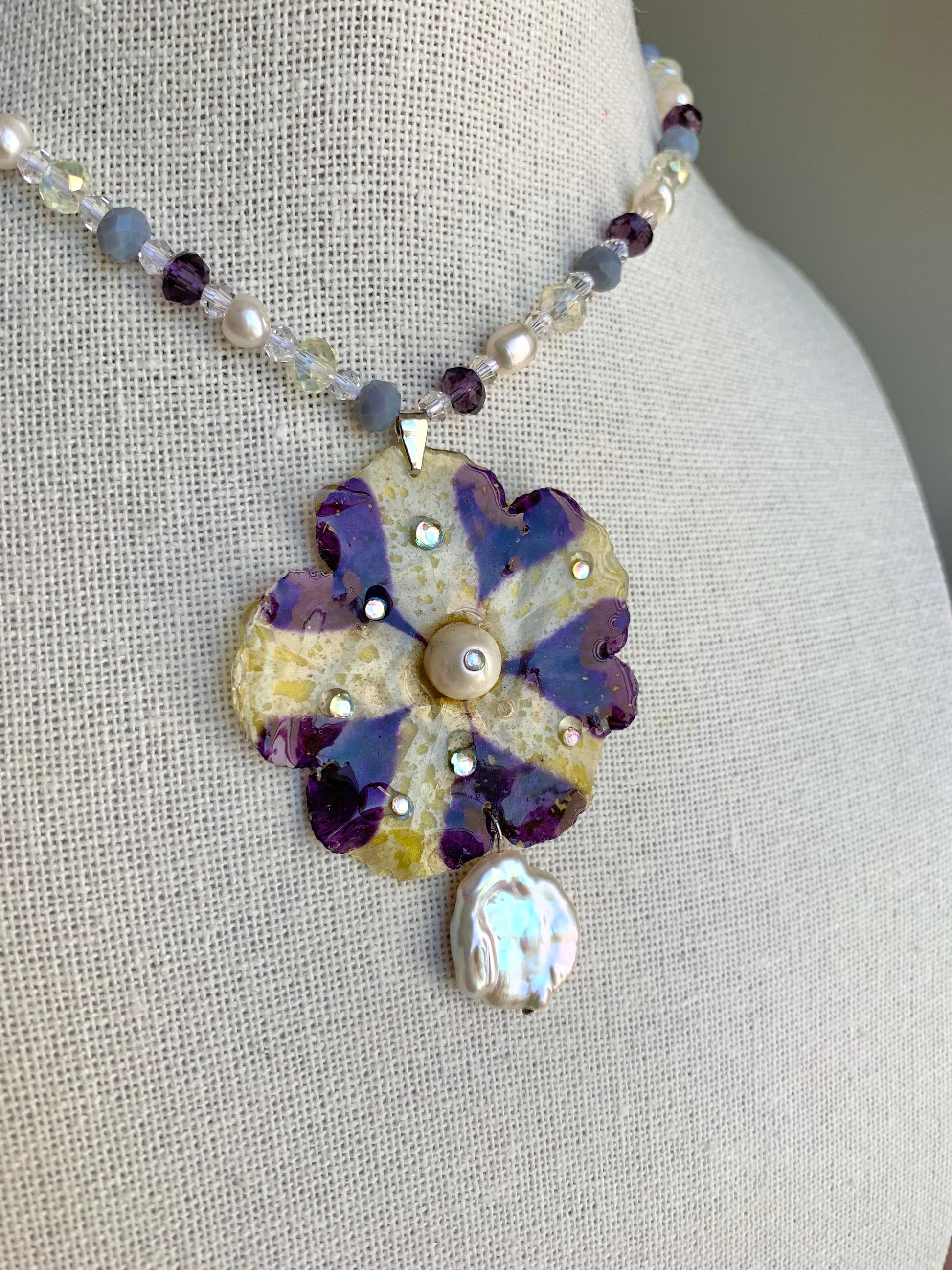 Handcrafted Real Petunia Flower Pendant on a Freshwater Pearl & Glass Beaded base, with Stainless Steel Findings & a Freshwater Pearl Coin. Adjustable at the back.