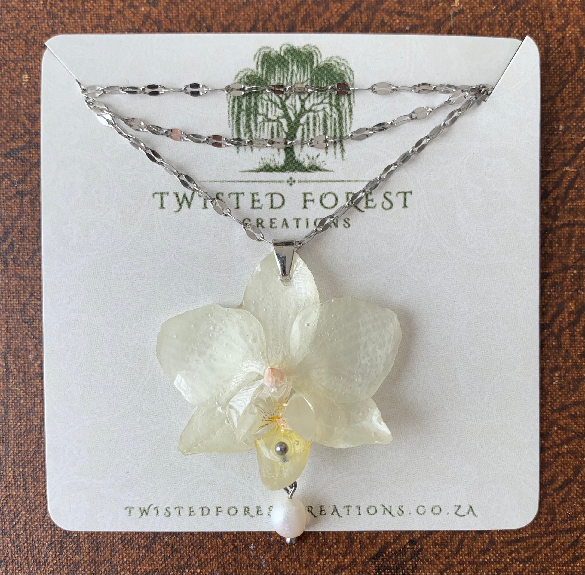 Real Orchid Flower sealed in resin, adorned with a Freshwater Pearl droplet on a Stainless Steel chain
